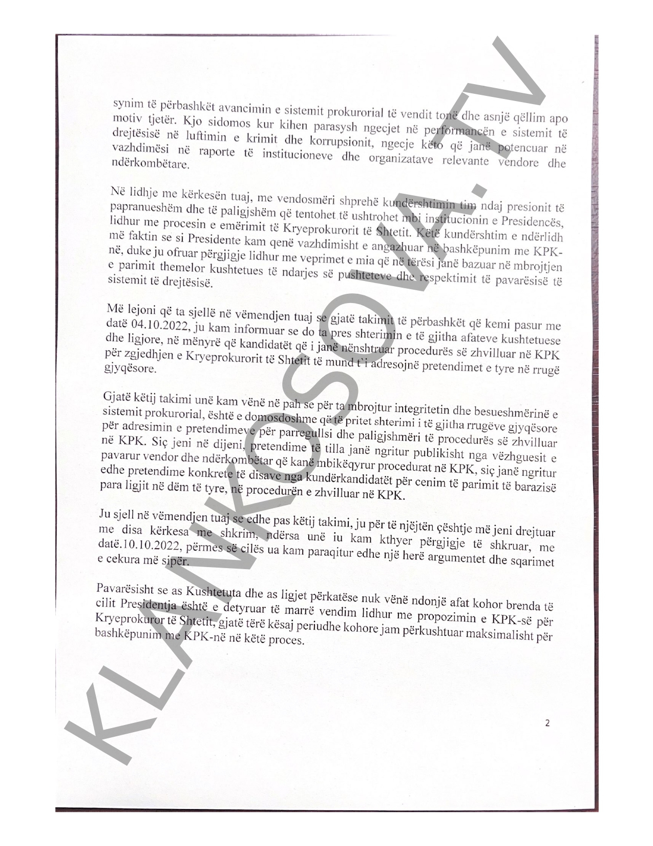 “Në lidhje me kërkesën tuaj, me vendosmëri shpreh kundërshtimin tim ndaj presionit të papranueshëm dhe të paligjshëm që tentohet të ushtrohet mbi institucionin e Presidencës, lidhur me procesin e emërimit të Kryeprokurorit të Shtetit. Këtë kundërshtim e ndërlidh me faktin se si Presidente kam qenë vazhdimisht e angazhuar në bashkëpunim me KPK-në, duke ju ofruar përgjigje lidhur me veprimet e mia që në tërësi janë bazuar në mbrojtjen e parimit themelor kushtetues të ndarjes së pushteteve dhe respektimit të pavarësisë së sistemit të drejtësisë”, thotë ndër të tjera letra e Presidentes drejtuar kryesuesit të KPK-së, Jetish Malokut, të cilën e ka siguruar Klankosova.tv.