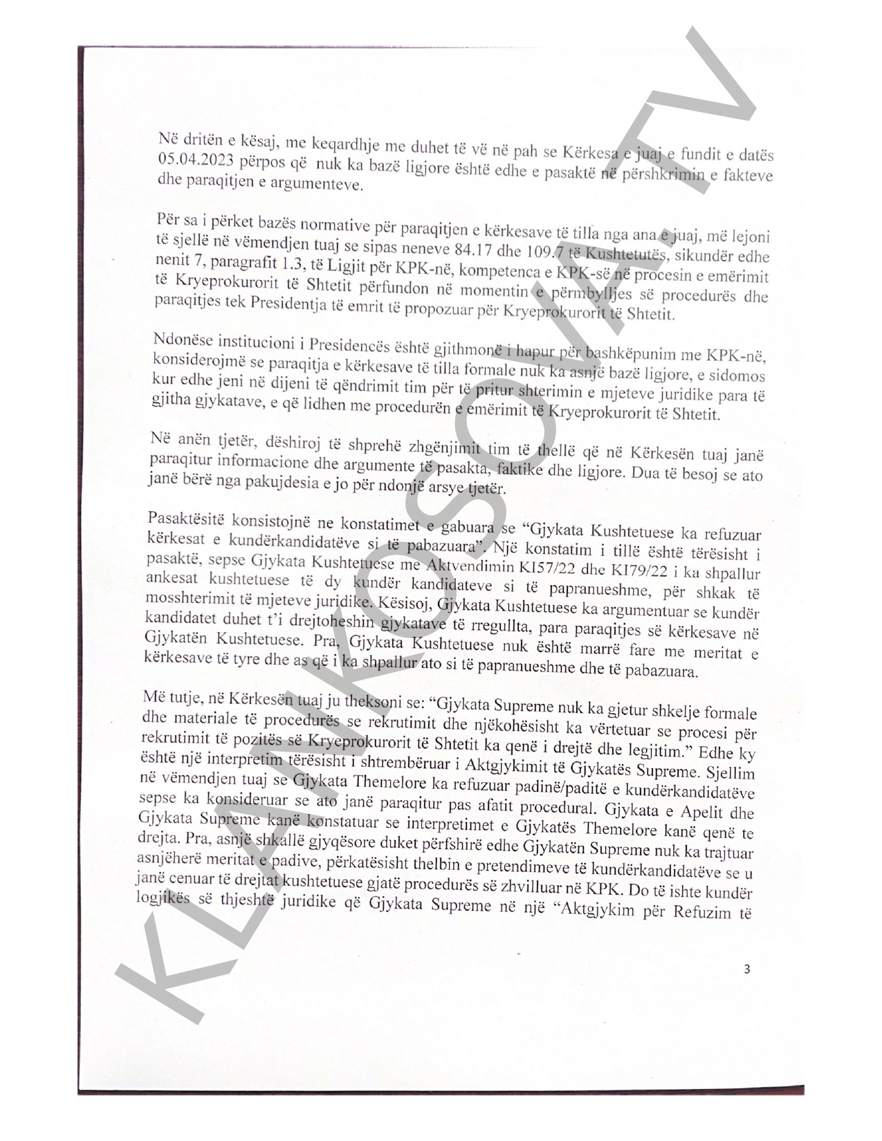 KPK-ja tha se kjo kërkesë është bërë duke marrë parasysh se janë shterur të gjitha rrugët ligjore që kanë rezultuar se procesi i rekrutimit, sipas tyre, për pozitën e Kryeprokurorit të Shtetit ka qenë i drejtë dhe legjitim.