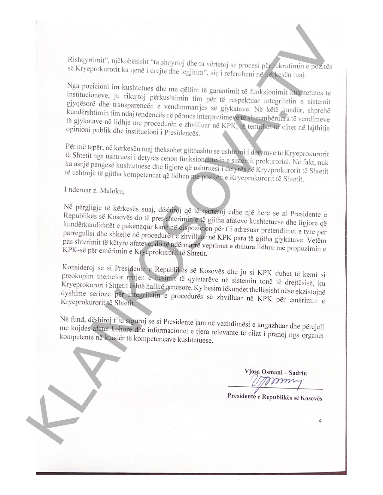 “Në dritën e kësaj, me keqardhje më duhet të vë në pah se Kërkesa juaj e fundit e datës 05.04.2023 përpos që nuk ka bazë ligjore është edhe e pasaktë në përshkrimin e fakteve dhe paraqitjen e argumenteve. Për sa i përket bazës normative për paraqitjen e kërkesave të tilla nga ana e juaj, më lejoni të sjell në vëmendjen tuaj se sipas neneve 84.17 dhe 109.7 të Kushtetutës, sikundër edhe nenit 7, paragrafit 1.3 të Ligjit për KPK-në, kompetenca e KPK-së në procesin e emërimit të Kryeprokurorit të Shtetit përfundon në momentin e përmbylljes së procedurës dhe paraqitjes tek Presidentja të emrit të propozuar për Kryeprokuror të Shtetit”, thotë ndër të tjera letra e Osmanit drejtuar Malokut.