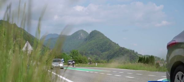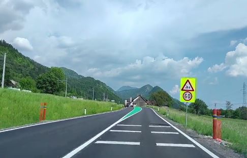 Në fshatin Potoki, përballë Jesenicës në Slloveni, një pjesë e rrugës ku nuk ka trotuar, është lyer me ngjyrë të gjelbër.