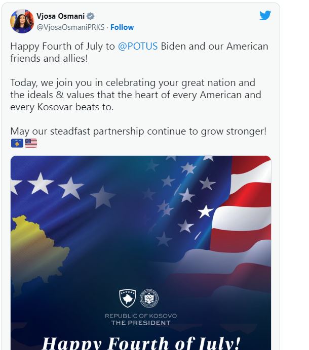 “Urime 4 Korriku presidentit Biden dhe miqve dhe aleatëve tanë amerikanë”, ka shkruar Osmani në Twitter.