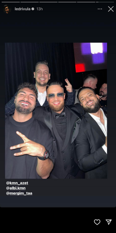 Ndërkaq, Ledri në ‘Instastory’ ndau një fotografi ku shihet krahë reperit Azet si dhe Dj Gimi O dhe Albit.