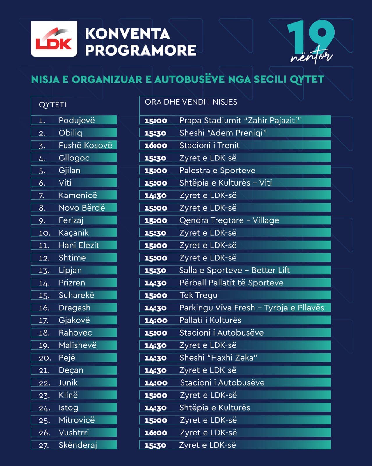 “Më 19 nëntor ju presim nga çdo anë e Kosovës. Më 19 nëntor, Lidhja është gati. Rruga e Re po nis. Eja bëhu pjesë e festës tonë të madhe! Le të ringrihemi si një! #rrugaere ”, ka shkruar ai në postim, ku ka bashkëngjitur edhe linjat dhe orarin e autobusëve që janë organizuar nga qytetet e vendit.