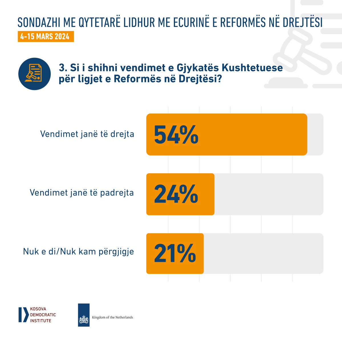 Në pyetjen se si i shohin qytetarët vendimet e Gjykatës Kushtetuese lidhur me ligjet e Reformës në Drejtësi, 54% e qytetarëve janë shprehur se aktgjykimet e Gjykatës janë të drejta, kundrejt 24% të tyre që i konsiderojnë vendimet si të padrejta. Ndërsa nuk kanë ofruar përgjigje 21% e të anketuarve.