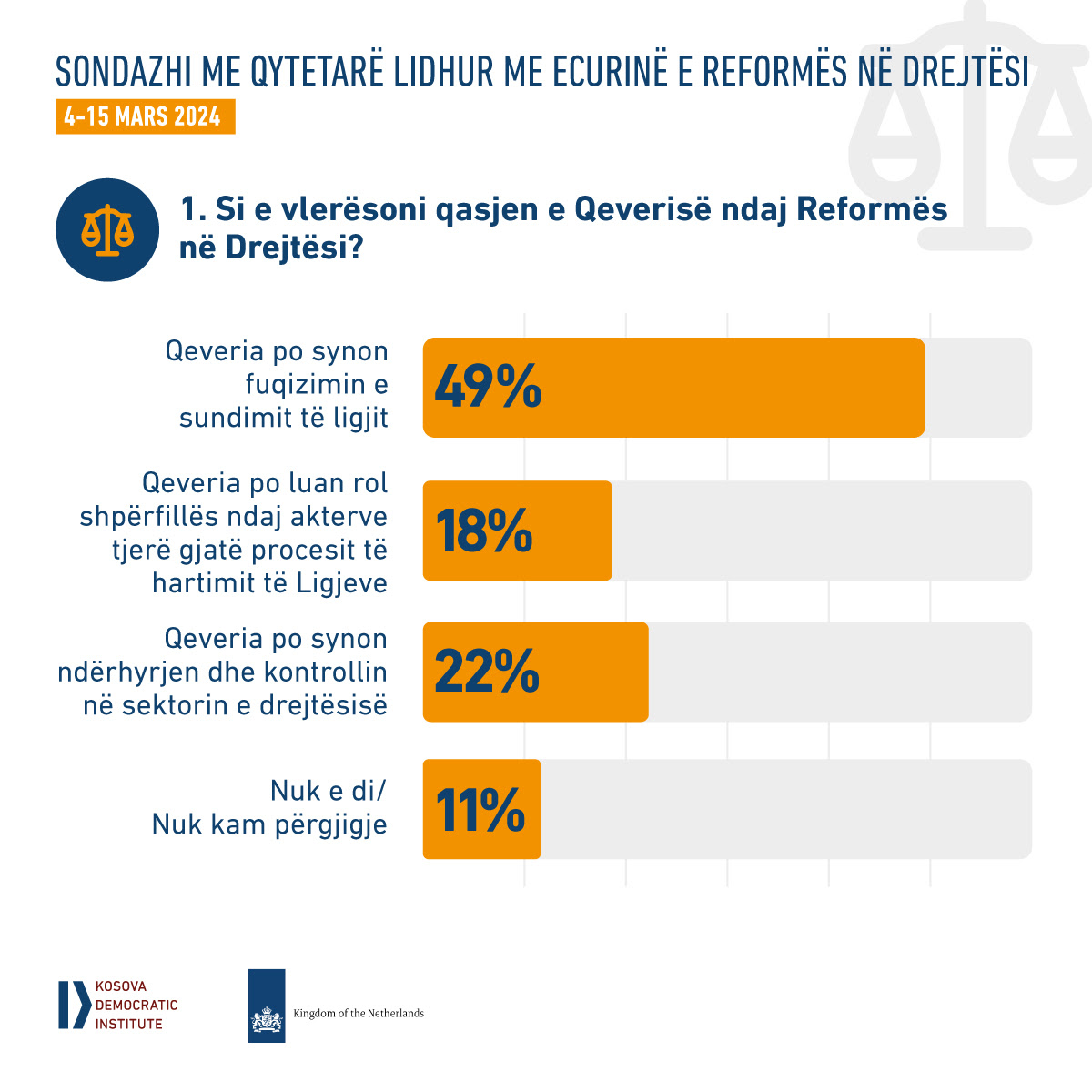 Në pyetjen drejtuar qytetarëve se si e vlerësojnë qasjen e Qeverisë ndaj Reformës në Drejtësi, 49% janë të mendimit se Qeveria me anë të reformës po synon fuqizimin e sundimit të ligjit, kundrejt 22% të qytetarëve që mendojnë se Qeveria me anë të reformës po synon ndërhyrjen në sektorin e drejtësisë. Ndërsa, 18% e tyre mendojnë se Qeveria po shpërfillë aktorët e tjerë gjatë procesit të hartimit të ligjeve, njofton KDI.