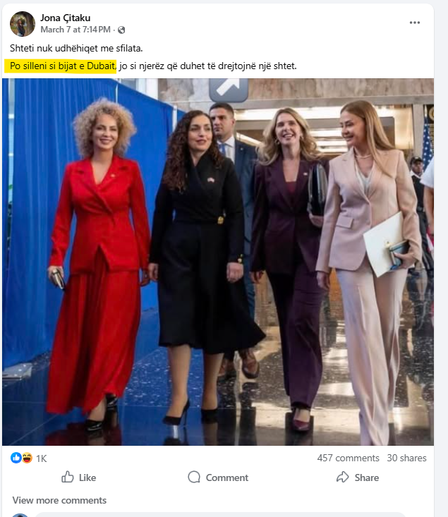 Në këtë baltosje një profil kryeson: e ashtuquajtura “Jona Çitaku,” profil i rremë i një gjoja-gruaje që Nacionale kishte raportuar gjerësisht mbi natyrën e përmbajtjeve propagandistike pro-Vetëvendosjes dhe demonizimit të rivalëve politikë dhe kundërshtuesve tjerë. Një postim nga e ashtuquajtura “Jona Çitaku” gjeneron angazhime enorme dhe shtrirje e shpërndarje të gjerë te përkrahës të partisë së Albin Kurtit, raporton “Nacionale”.