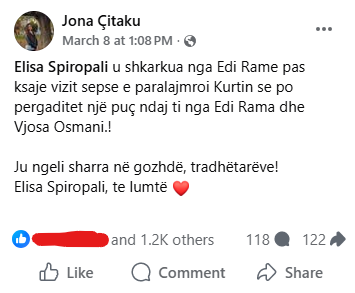 Në këtë tregim të “puçit” që po servohet te përkrahës tjerë të painformuar të Vetëvendosjes, jepet largimi i Elisa Spiropalit nga qeveria shqiptare, si gjoja “ajo erdhi në Kosovë dhe e paralajmëroi Kurtin për planin për puç.” Një tregim i tillë, i pambështetur, dhe fiktiv, ka gjetur audiencë të gjerë. Gjuha shkoi deri në atë pikë sa fjalët ndaj saj shkuan deri edhe në oktava “pushkatimi.”