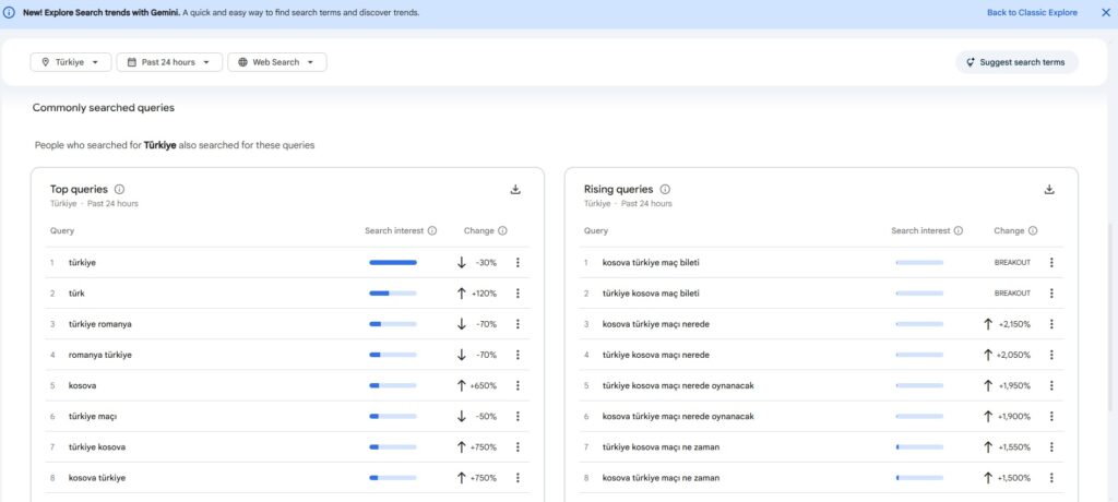 Ndërkaq, te kategoria “Kërkimet në rritje”, shprehjet “Bileta për ndeshjen Kosovë-Turqi” dhe formulime tjera të ngjashme për temën e njëjtë, janë në “Breakout” (Shpërthim).